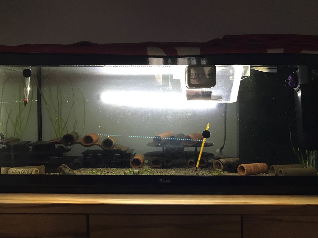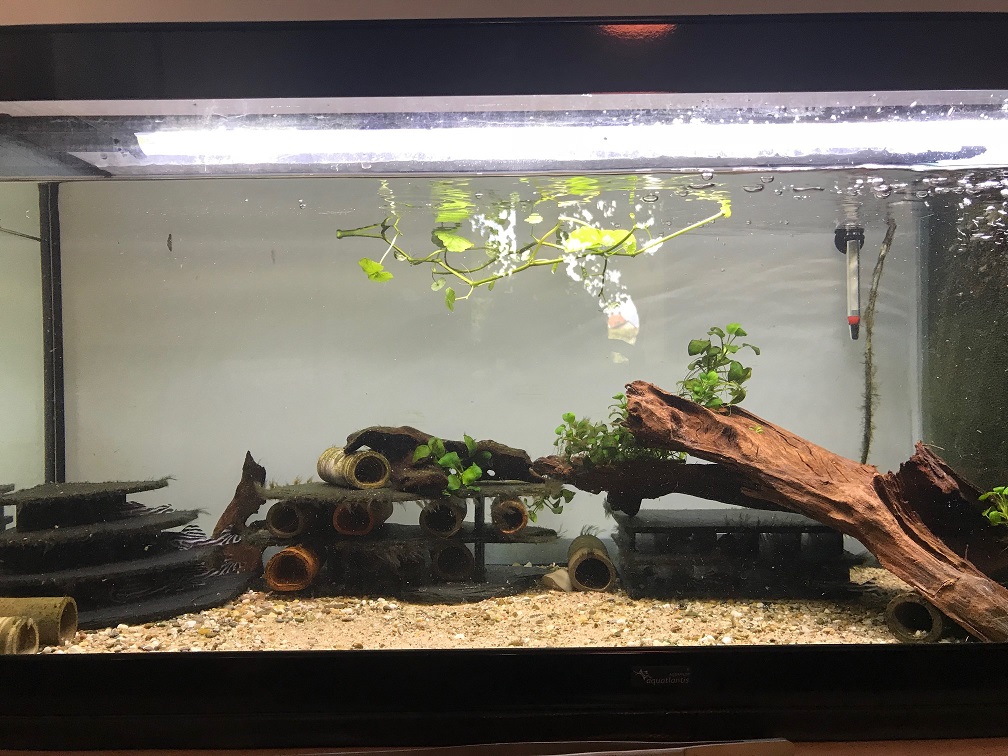 Im Grunde genommen nur Tonhöhlen und Schieferaufbauten als Einrichtung... mit Pflanzen habe ich im Moment absolut kein Glück, auch hier wäre ich über Ratschläge dankbar.